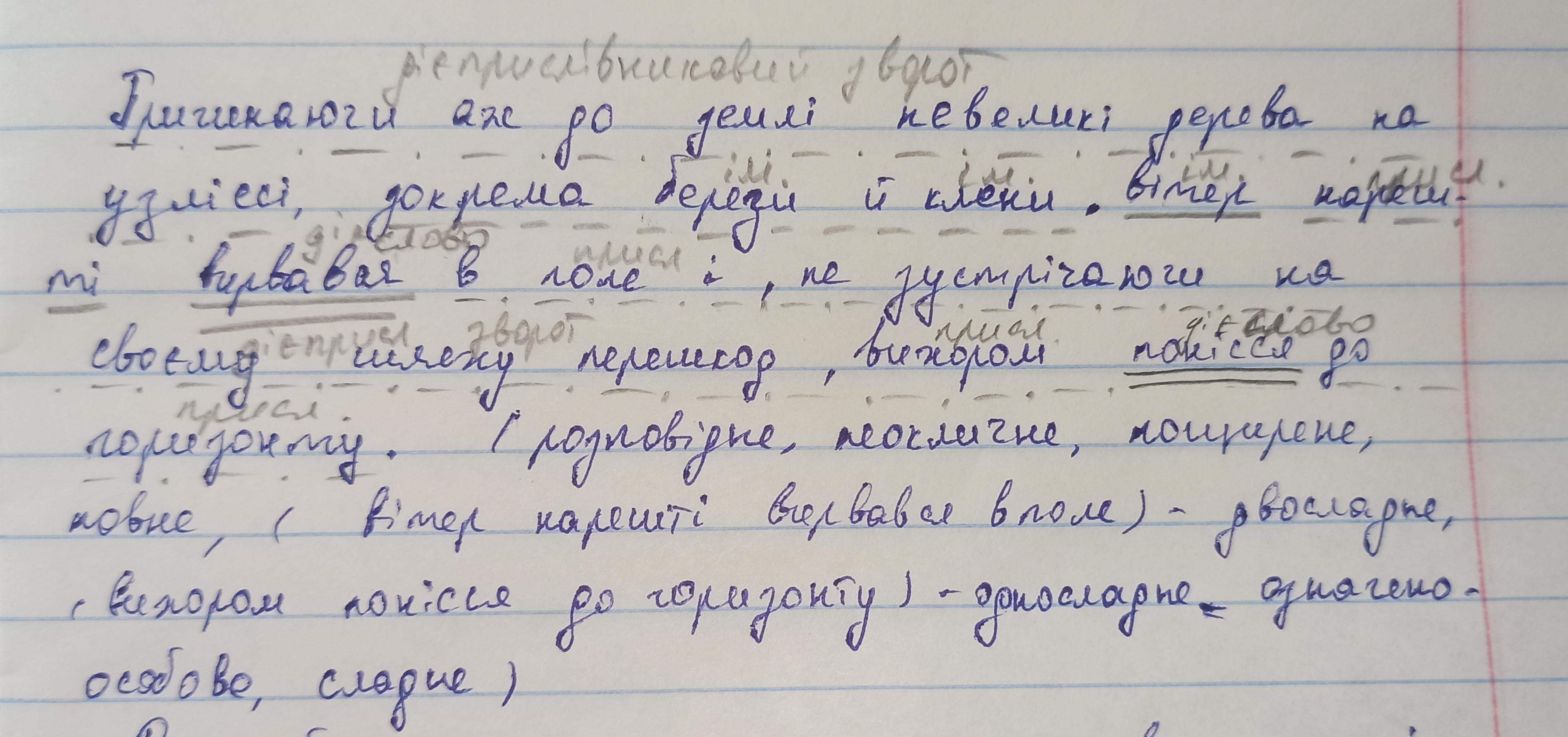4. Пригинаючи аж до землі невеликі дерева на узліссі, вітер нарешті виривався в полі і не зустрічаючи на своєму шляху перешкод - вихором нісся до горизонту.