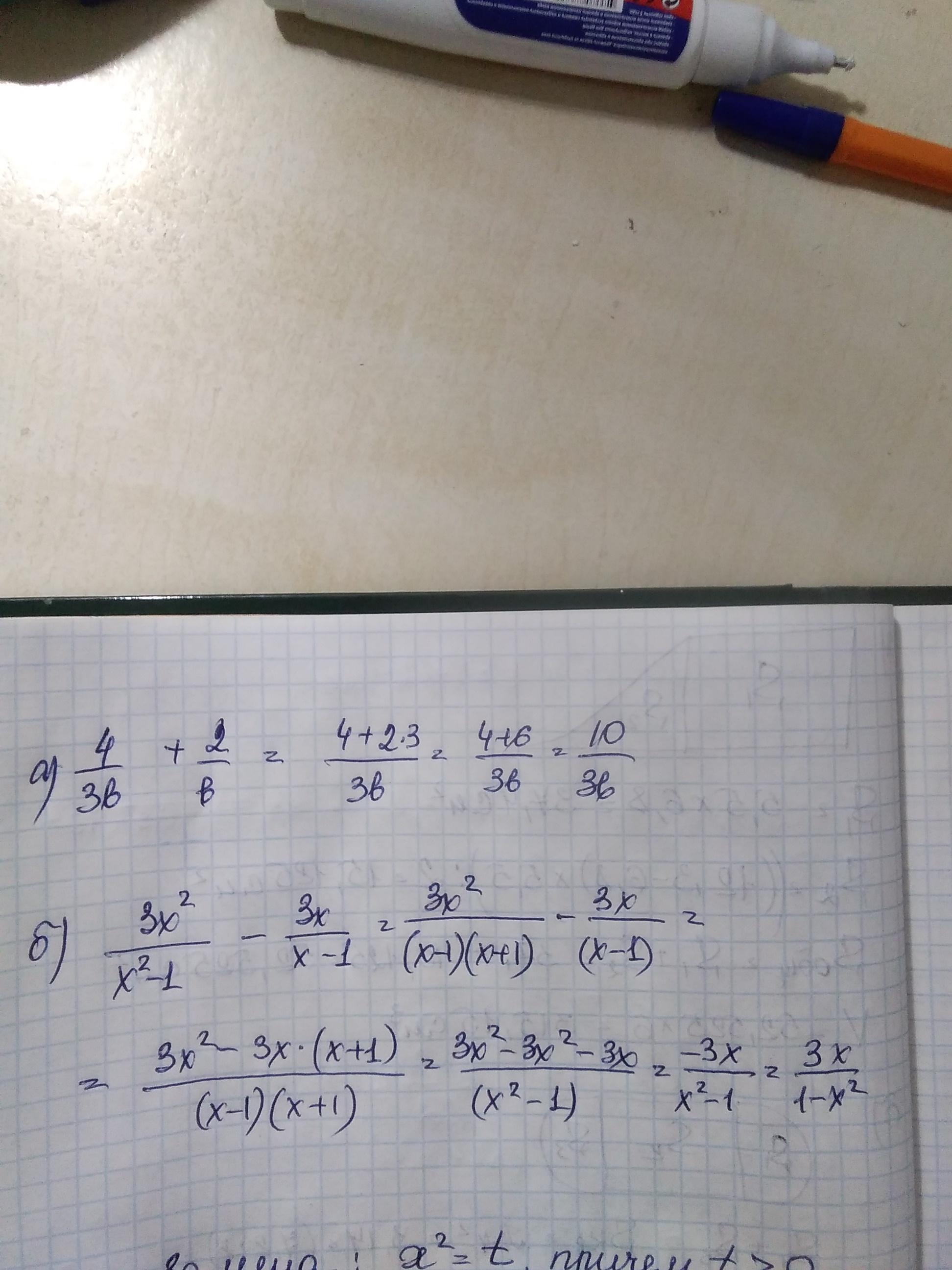 выполните умножение и деление алгебраических дробей а) 4/3b+2/b б)3х²/х²-1-3х/х-1 ДАЮ 100 БАЛОВ