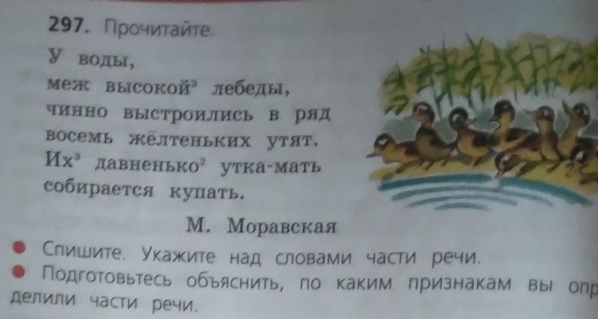 У - предлог, воды - имя существительное, меж - предлог, высокой - имя прилагательное, лебеды - имя существительное, чинно - наречие, выстроились - глагол, в - предлог, ряд - имя существительное, восемь - имя числительное, жёлтеньких - имя прилагательное, утят - имя существительное, их - местоимение, давненько - наречие, утка - имя существительное, мать - имя существительное, собирается - глагол, купать - глагол.