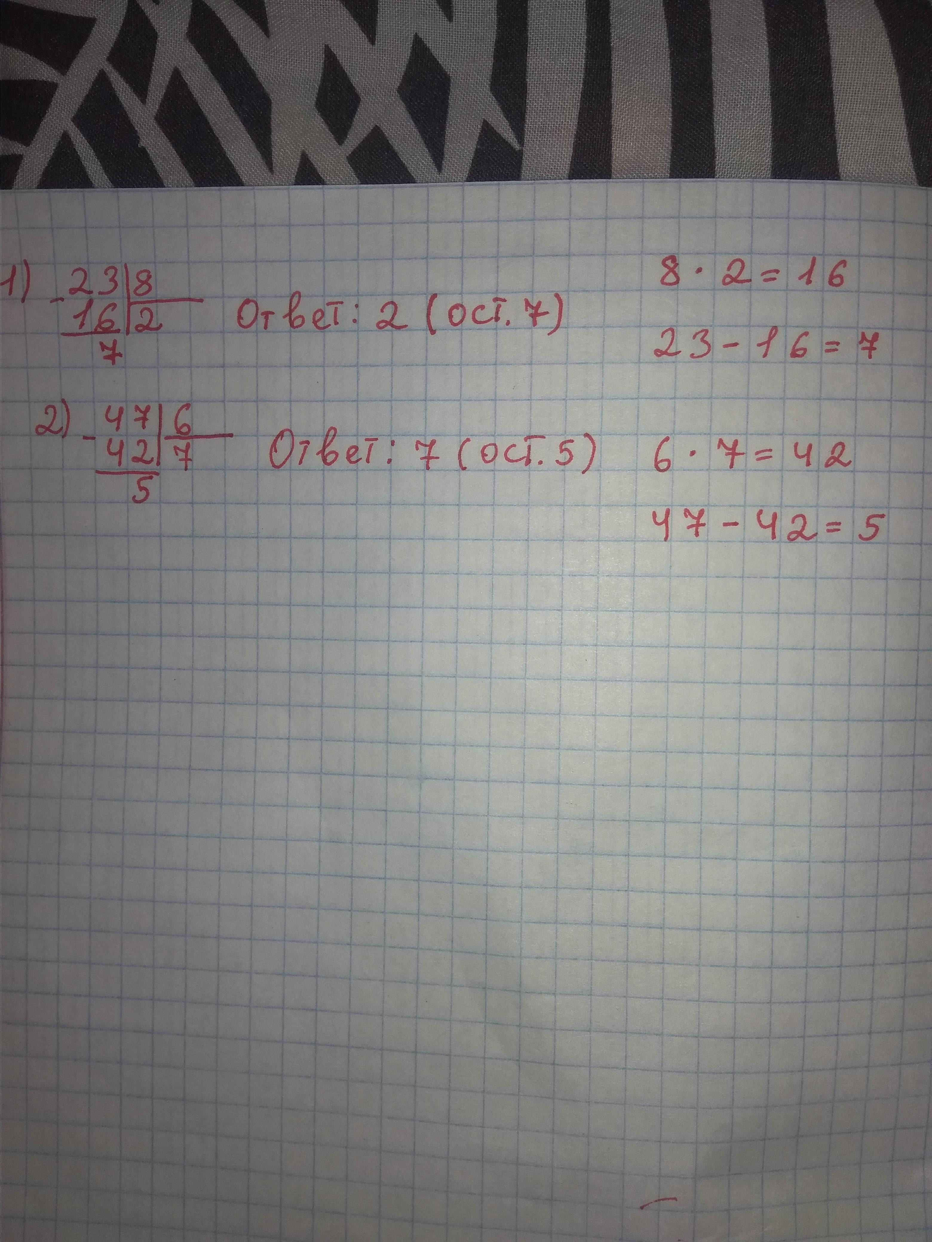 23:8=2, остача 7 або 2⅞ 47:6= 7 и остача 5