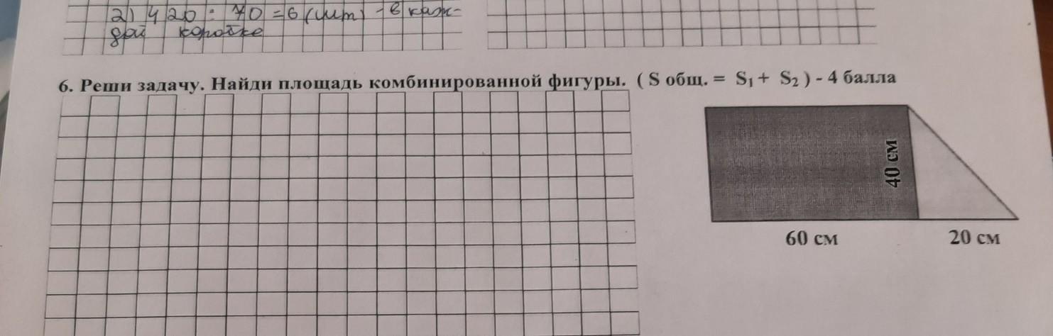 6. Реши задачу. Найди площадь комбинированной фигуры. (S общ. = S + S2 ) - 4 балла 40 см 60 см 20 см