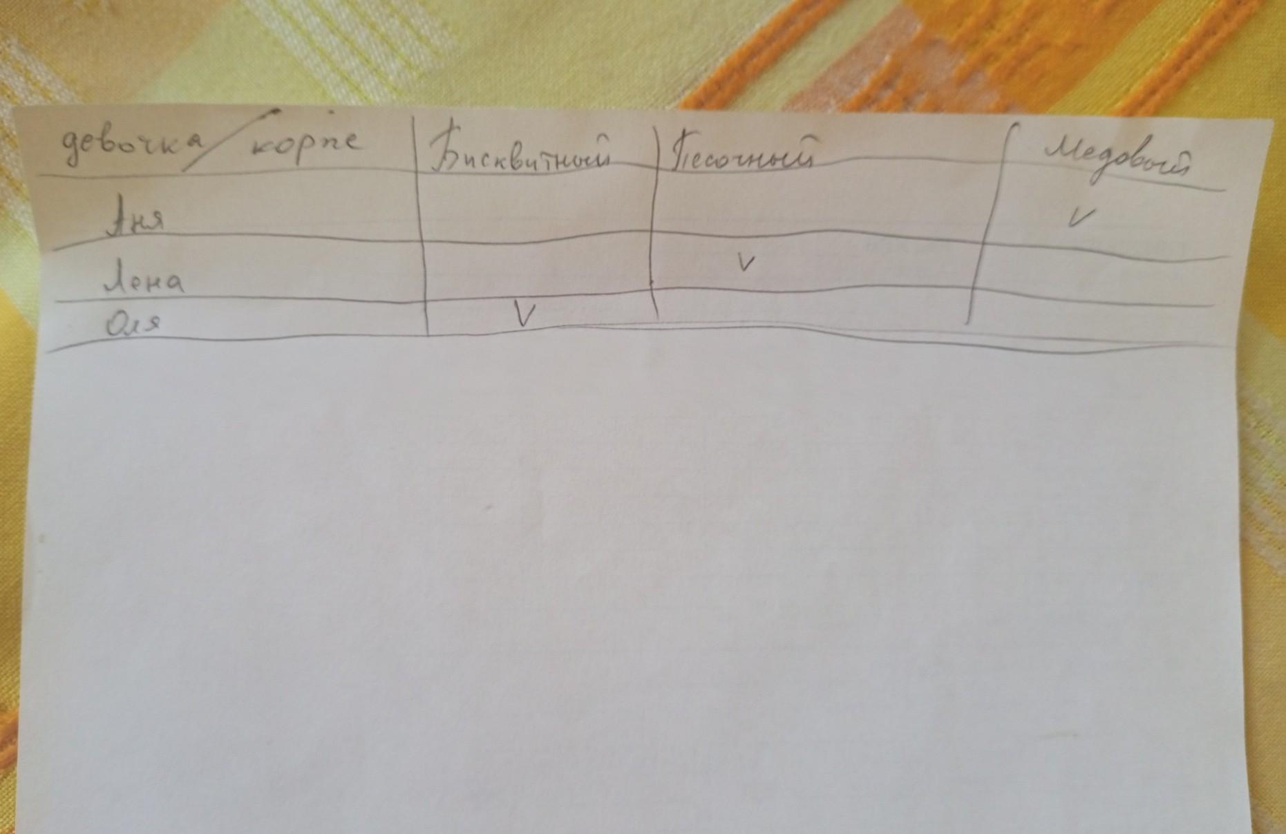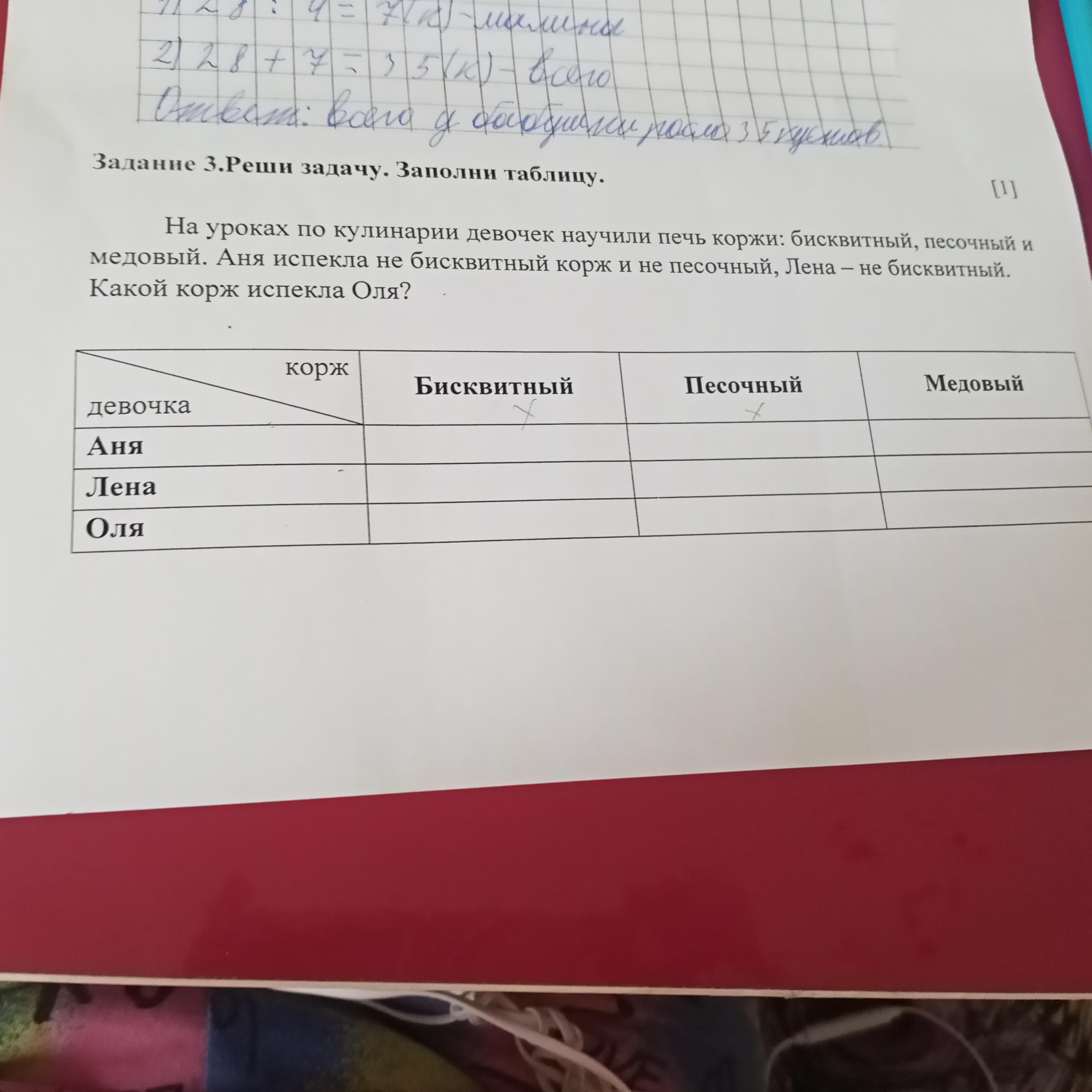 Задание 3.Реши задачу.Заполни таблицу.На уроках по кулинарии девочек научили печь коржи:бисквитный,песочный и медовый.Аня испекла не бисквитный корж и не песочный,Лена-не бисквитный.Какой корж испекла Оля?СоЧ математика 4четверть 1 вариант 3 класс