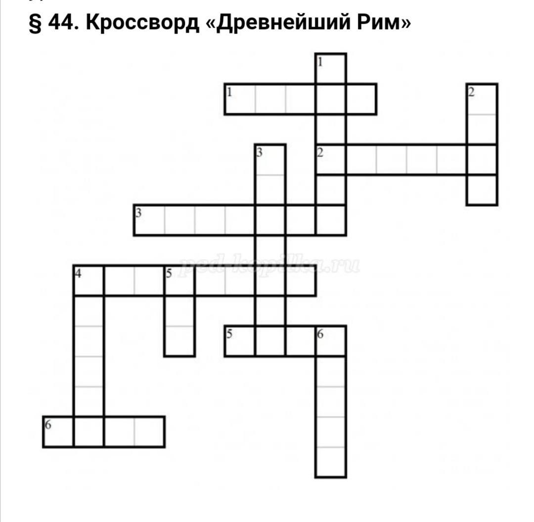 По горизонтали: 1. Веста; 2. Ликтор; 3. Сицилия; 4. Патриции; 5. Марс; 6. Тибр.