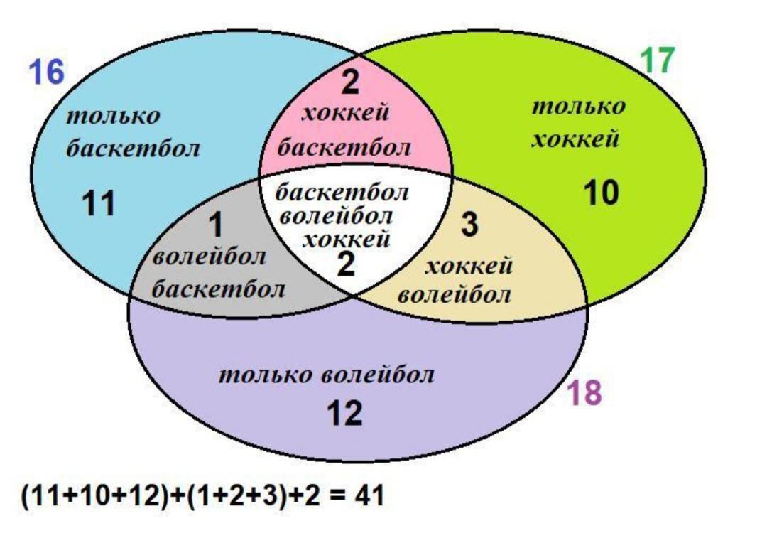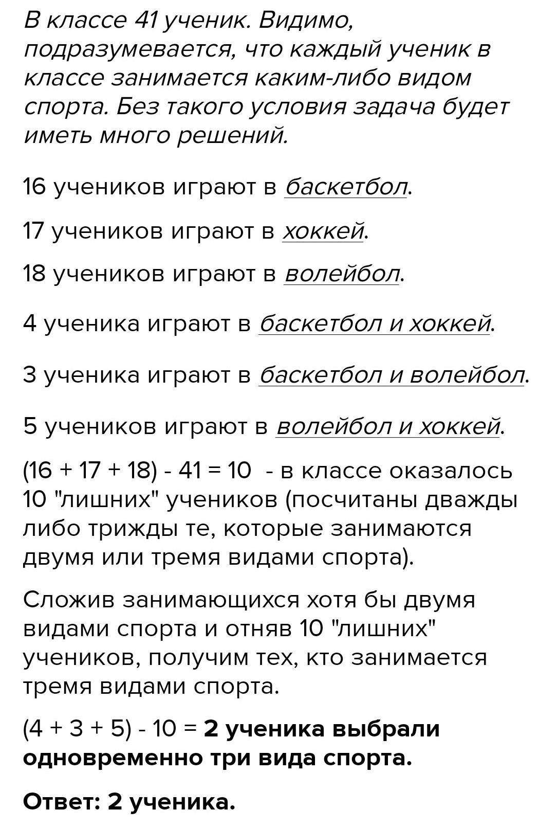 У класі 41 учень . З них 16 учнів грають у баскетбол , 17 - у хокей , 18- у волейбол . Баскетболом і хокеєм захоплюються 4 учні , баскетболом і волейболом - 3 , волейболом і хокеем - 5 учнів . Скільки учнів обрпли одночасно три види спорту ?