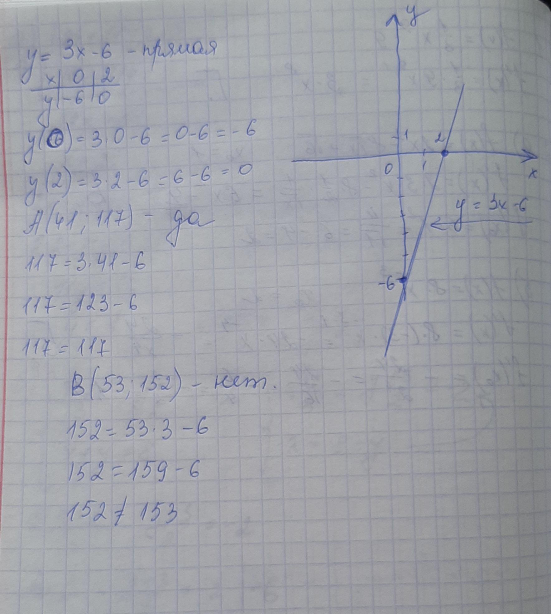 Постройте график функции у = 3х – 6 и определите, проходит ли он через точки А (41; 117) и В (53; 152). Ответьте пожалуйста