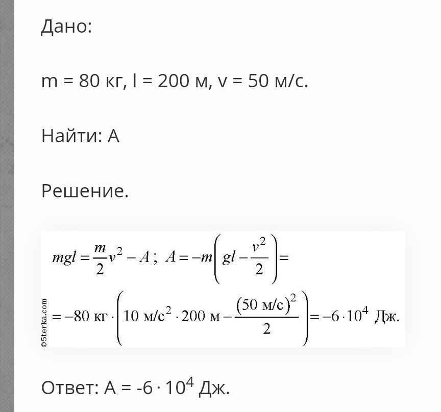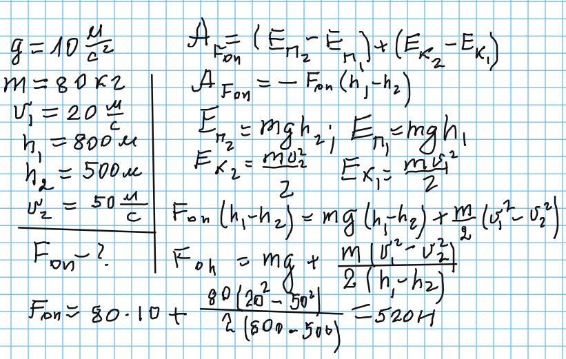 Парашутист, маса якого 80кг, відокремився від гелікоптера, що рухався зі швидкістю 20м/с на висоті 800 м. На висоті 500м швидкість парашутиста була 50м/с. Визначте роботу сили опору повітря