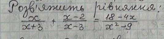 \displaystyle\bf\\\frac{x}{x+3} +\frac{x-2}{x-3} =\frac{18-4x}{x^{2} -9} \\\\\\\frac{x}{x+3} +\frac{x-2}{x-3} -\frac{18-4x}{(x -3)(x+3)} =0\\\\\\\frac{x\cdot(x-3)+(x-2)\cdot(x+3)-18+4x}{(x-3)(x+3)} =0\\\\\\\frac{x^{2} -3x+x^{2} +3x-2x-6-18+4x}{(x-3)(x+3)} =0\\\\\\\frac{2x^{2} +2x-24}{(x-3)(x+3)} =0\\\\\\\left \{ {{2x^{2} +2x-24=0} \atop {x-3\neq 0 \ , \ x+3\neq 0}} \right. \\\\\\\left \{ {{x^{2} +x-12=0} \atop {x\neq 3 \ , \ x\neq -3}} \right. \\\\\\x^{2} +x-12=0