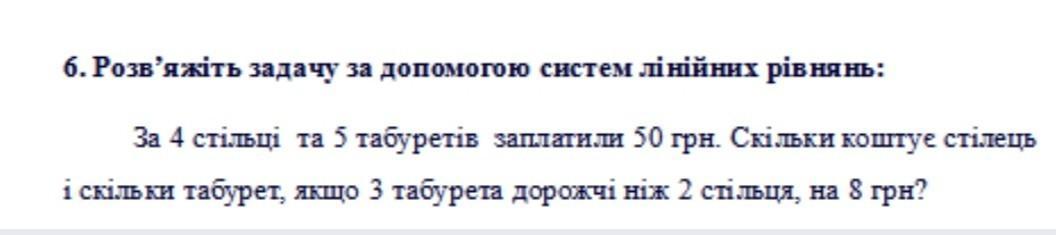 СРОЧНО! За 4 стільці та 5 табуретів заплатили 50 грн. Скільки коштуе стілець