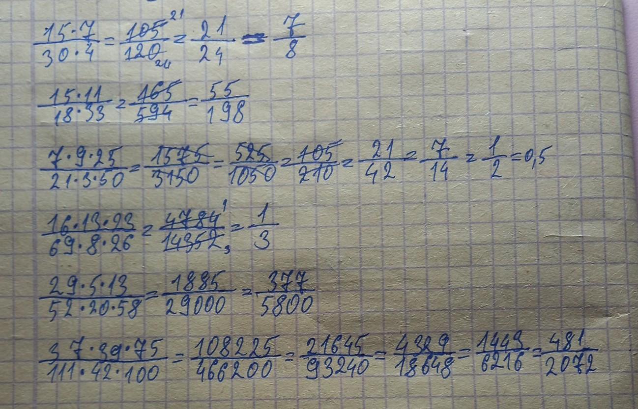 3) 7*9*25/21*3*30=5/6 4) 16*13*23/69*8*26=2/3
