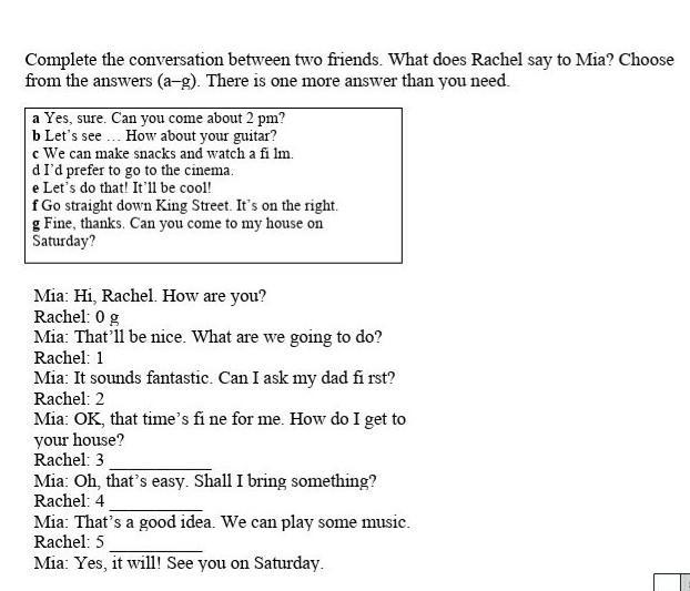 Task 3 Use of English (5 points) Complete the conversation between two friends. What does Rachel say to Mia? Choose from the answers (a-g). There is one more answer than you need, a Yes, sure. Can you come about 2 pm? b Let's see ... How about your guitar? c We can make snacks and watch a fi lm. d I'd prefer to go to the cinema. e Let's do that! It'll be cool! fGo straight down King Street. It's on the right. g Fine, thanks. Can you come to my house on Saturday?