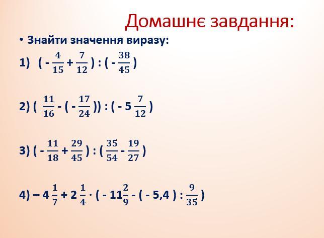 1)(-4/15+7/12)÷(38/45)=(-16/60+35/60)÷(-3 8/45)=19/60÷(-38/45)=19/60 ×(-45/38)= -3/8