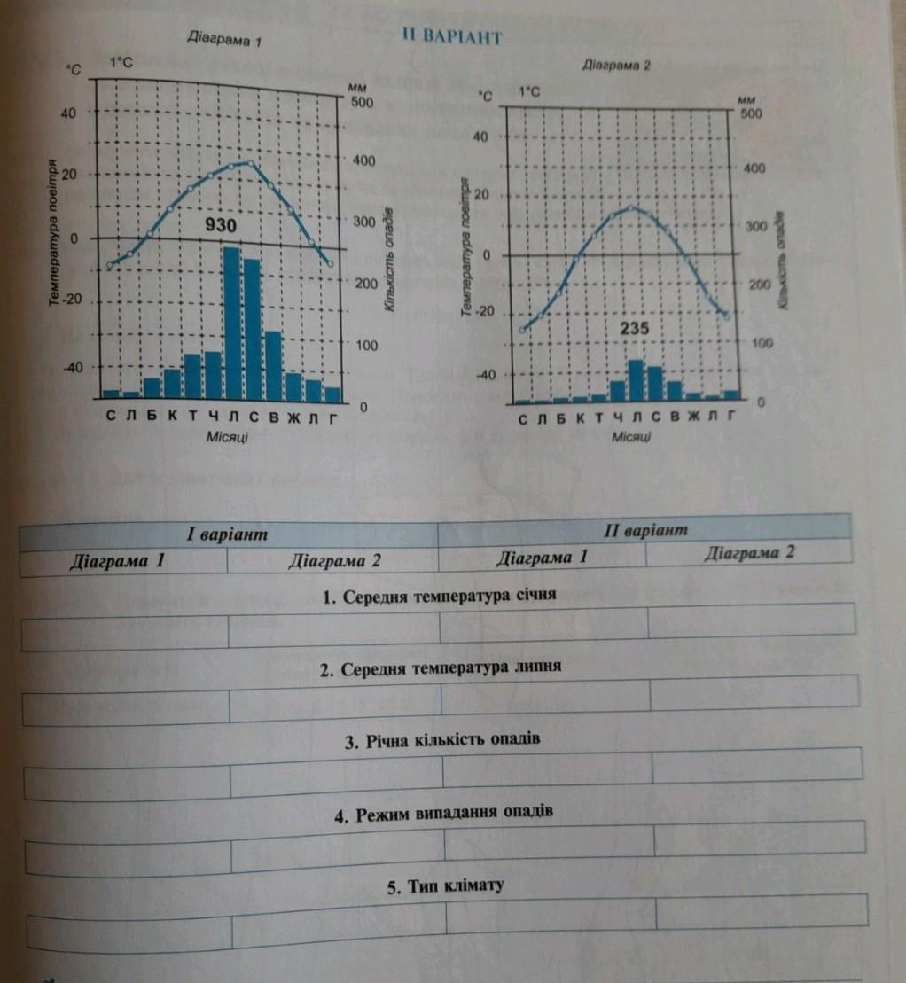 1.діаграма.середня температура січня -9 градусів;середня температура липня +25градусів;річна кількість опадів 930мм;режим випадання опадів в лютому 4мму липні 249мм.