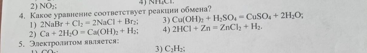 СРОЧНО! 4. Какое уравнение соответствует реакции обмена? 1) 2NaBr + Cl2 = 2NaCI + Br2; 3) Cu(OH)2 + H,SO4 = CuSO4 + 2H,0; 2) Са + 2H2O = Ca(OH)2 + H2; 4) 2HCl + Zn = ZnCl2 + H2.