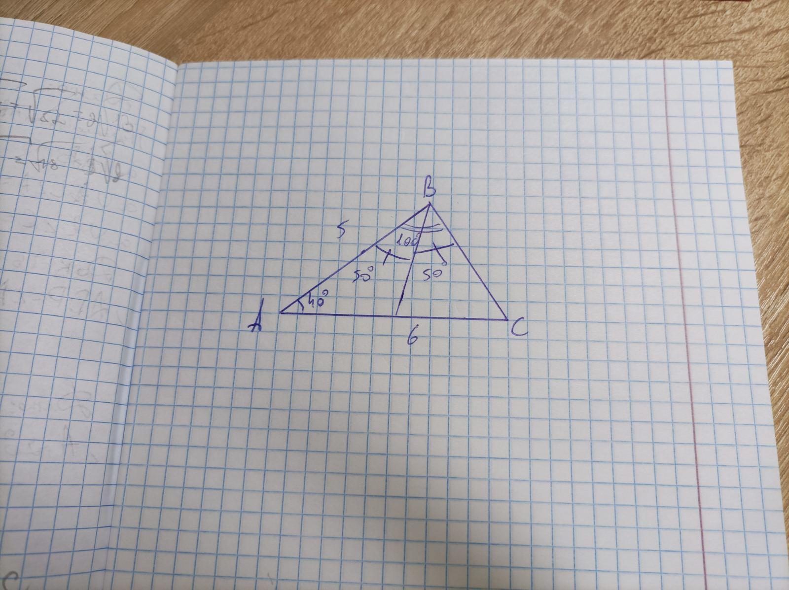 AB = 5 см, AC = 6 см, ZA=40°. В полученном треугольнике постройте биссектрису