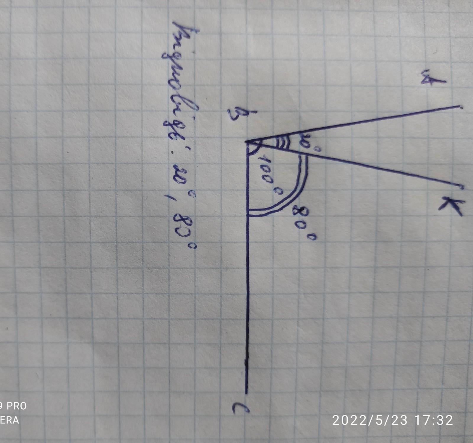 .Из вершины угла проведите луч так, чтобы один из образовавшихся углов был в 4 раза больше другого. Определите величины получившихся углов.