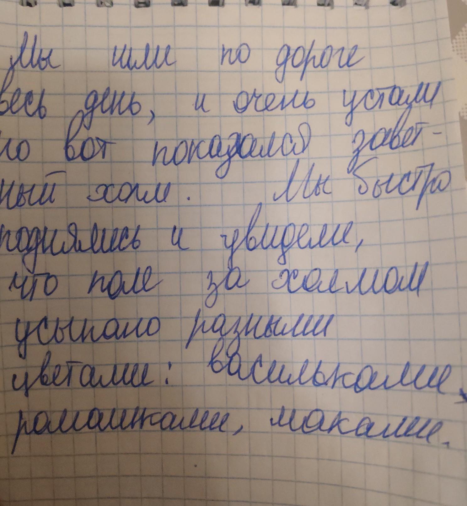 Мы шли по дороге весь день и очень устали но вот показался заветный холм. Денис первым забрался на него и закричал: Ребята идите сюда! Мы быстро поднялись и увидели, что поле за холмом усыпано разными цветами васильками ромашками маками. Над ними порхали яркие бабочки вились прозрачные стрекозы. А вот и цель нашего похода круглое озеро.