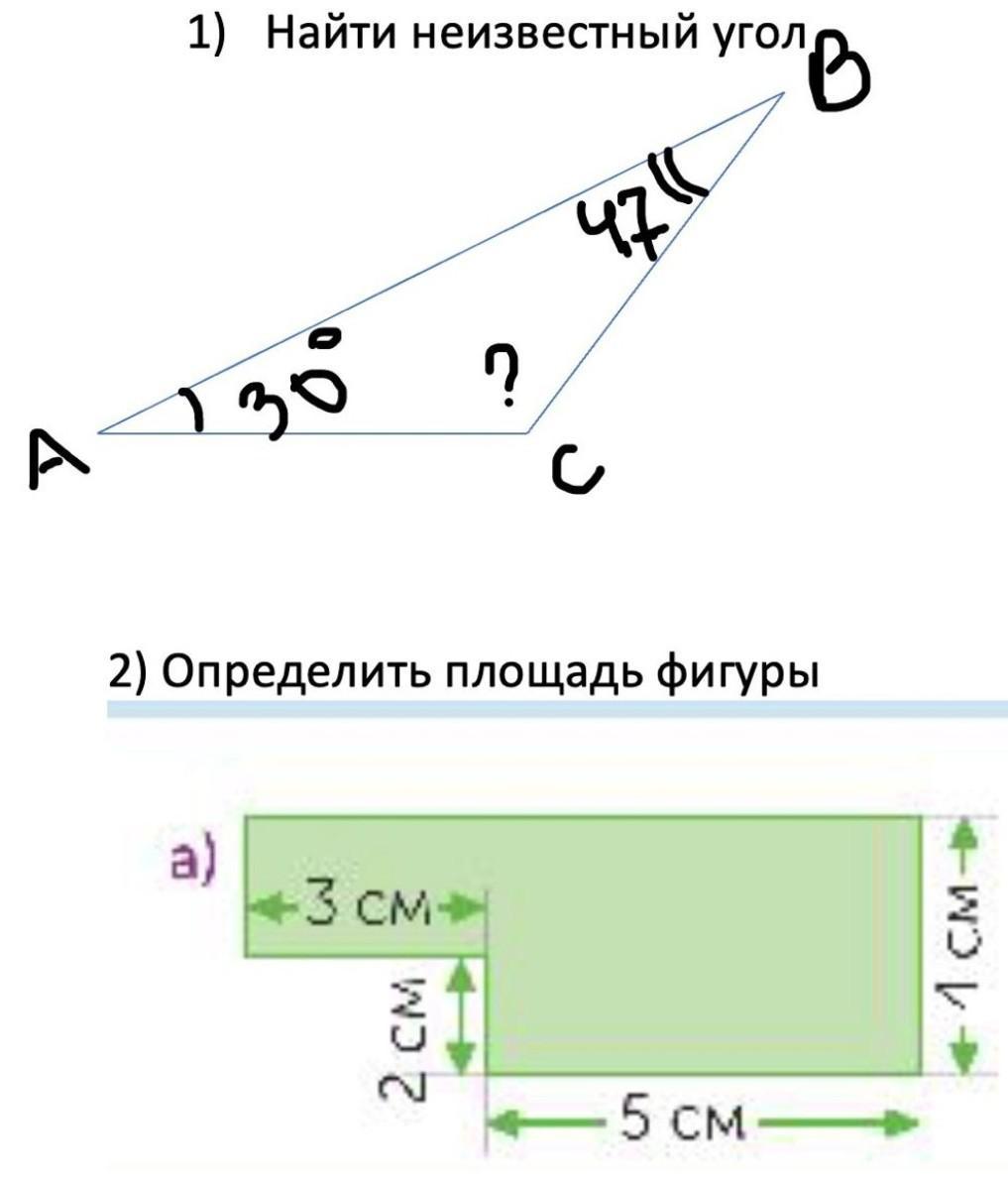 1) Найти неизвестный угол 2) Определить площадь фигуры