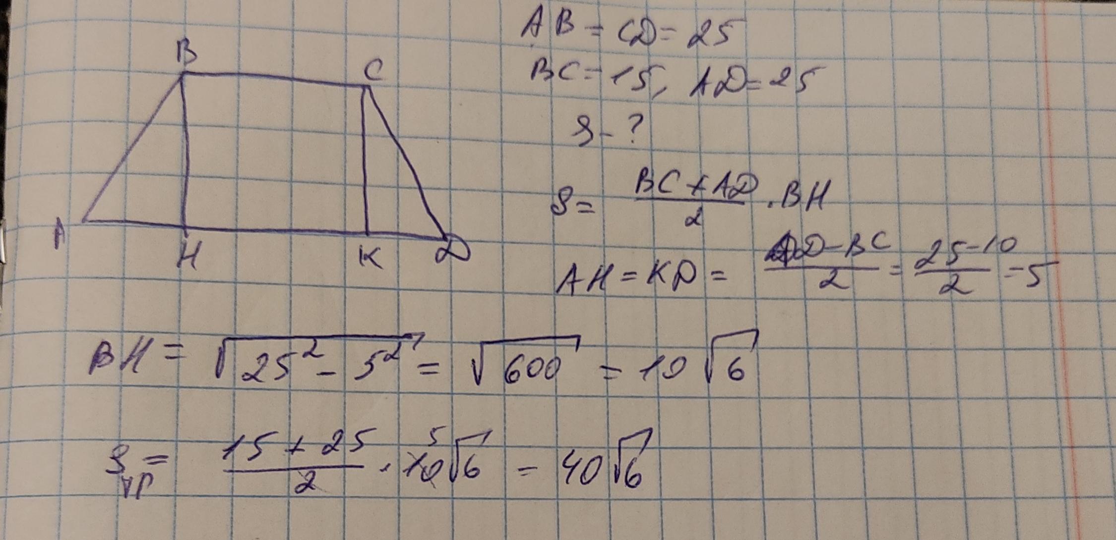 В равнобедренной трапеции боковые стороны 25 дм², а основание 15 и 25 дм. Найдите площадь трапеции.