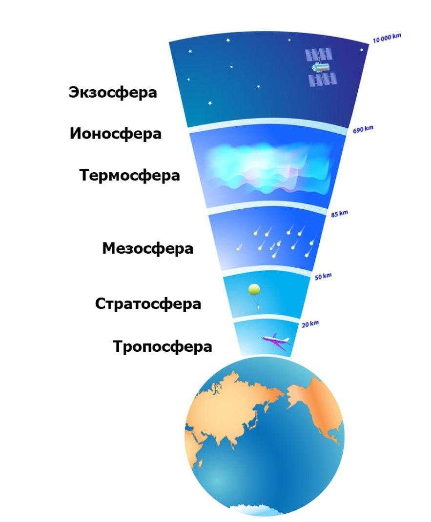 Атмосфера-это воздушная оболочка Земли, которая состоит из следующих слоёв.