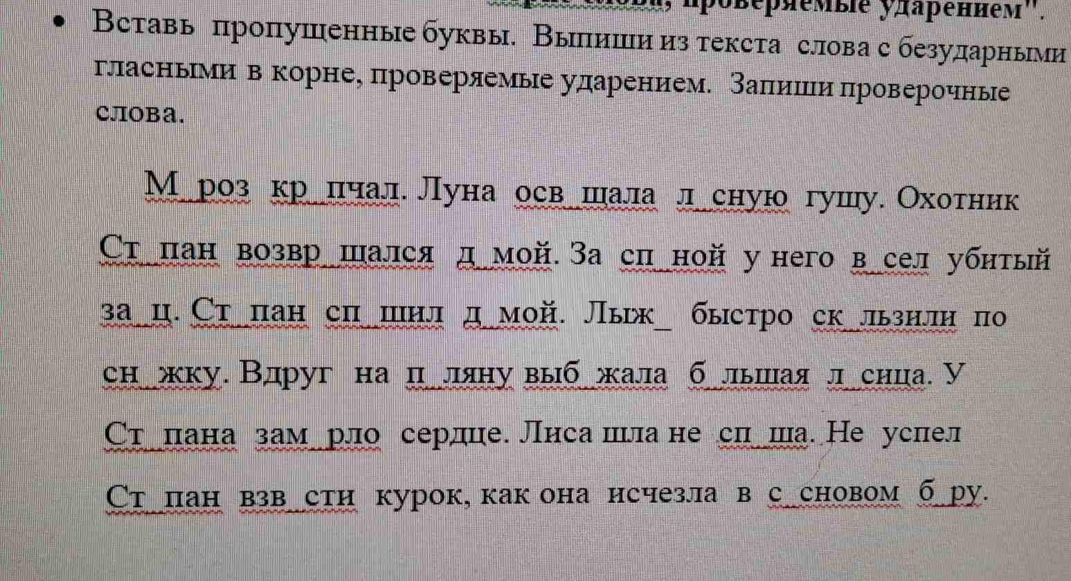 Мороз крепчал. Луна освещала лесную гущу. Охотник Степан возвращался домой. За спиной у него висел убитый заяц. Степан спешил домой. Лыжи быстро скользили по снежку. Вдруг на поляну выбежала большая лисица. У Степана замерло сердце. Лиса шла не спеша. Не успел Степан взвести курок, как она исчезла в сосновом бору.
