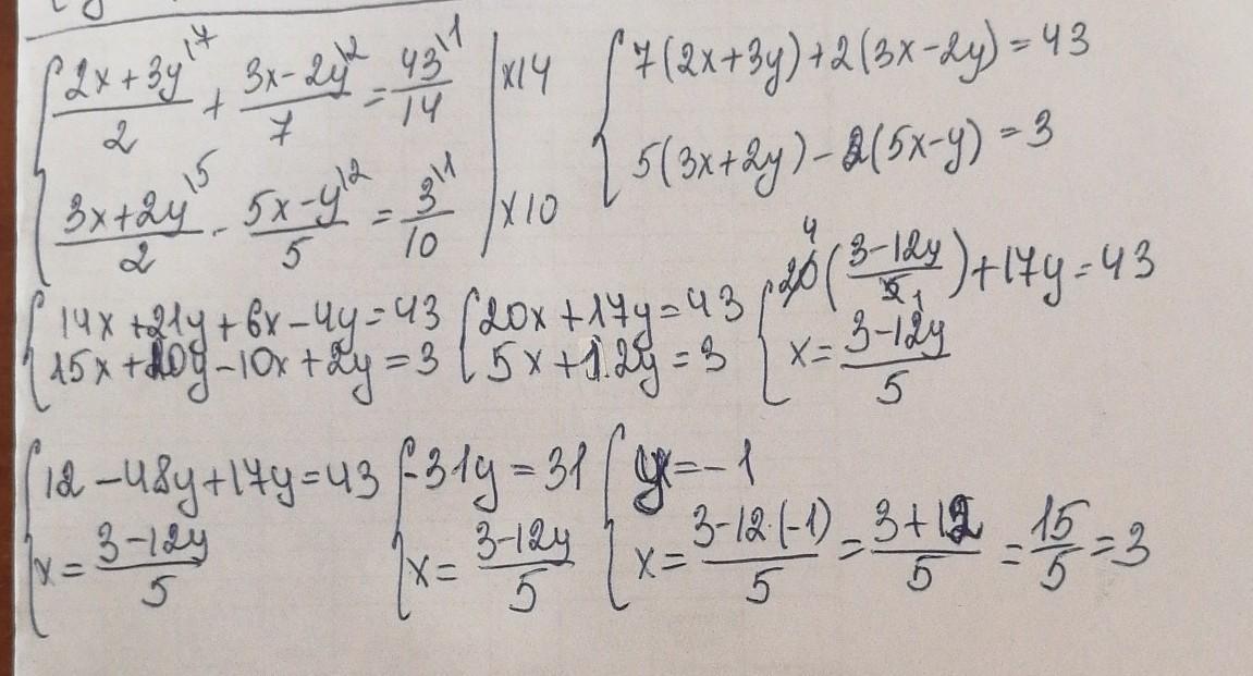 7(2x+3y)+2(3x-2y)=43; 20x+15y=43
