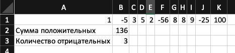 excel. Дана последовательность из 20 целых чисел. Составить программу вычисления суммы и количества всех положительных и всех отрицательных чисел. microsoft excel