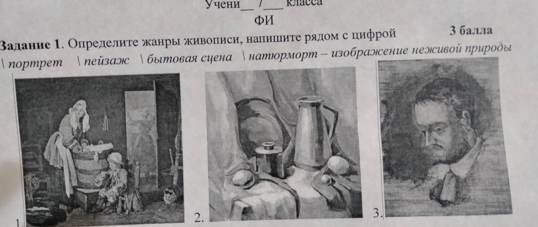 Определите жанры живописи, напишите рядом с цифрой 3 балла І пейзаж 1 бытовая сцена І натюрморт — изображение неживой природы 1 \ портрет 1. 2. 3.