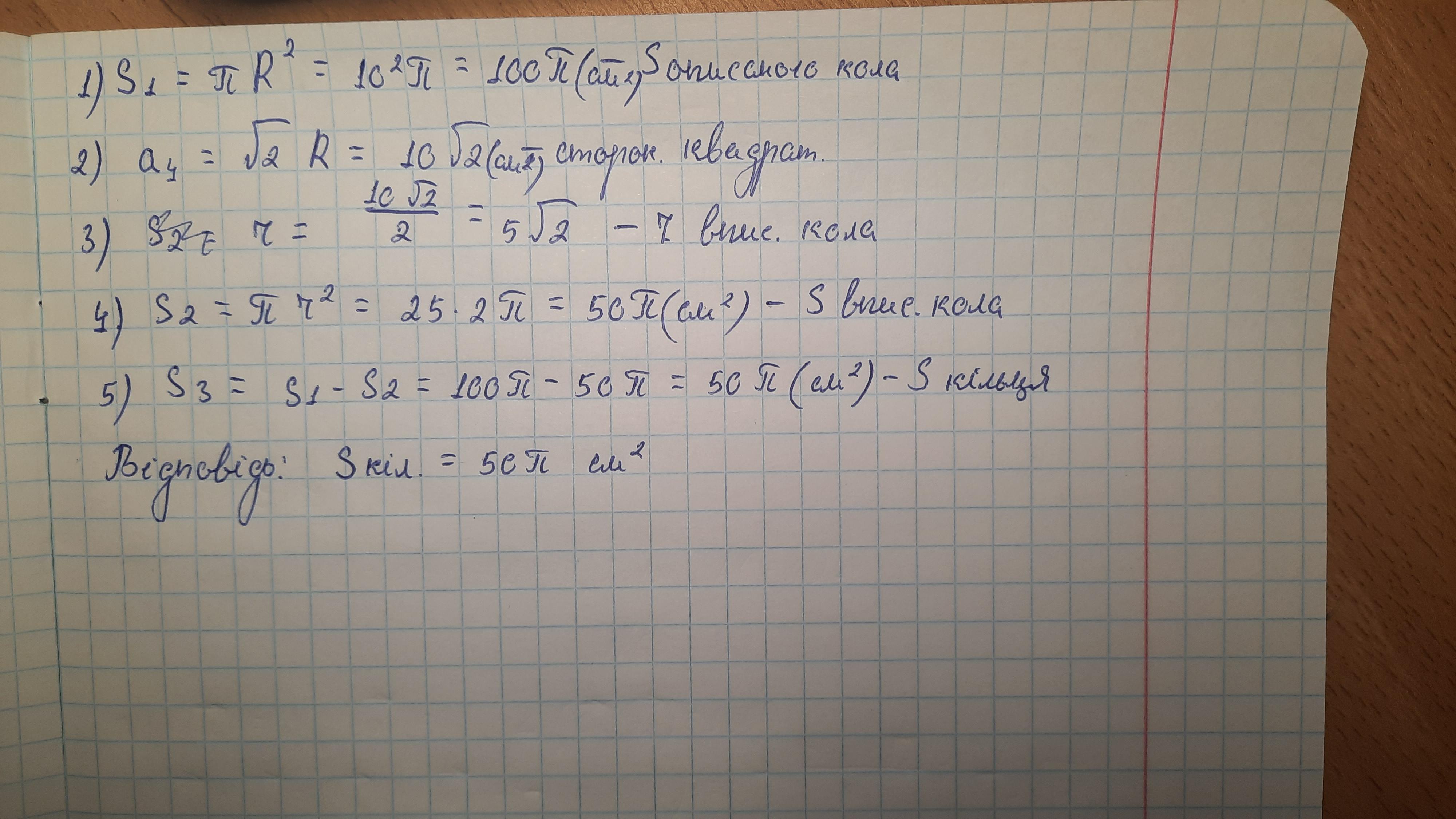 У коло радіусом 10 см вписано квадрат ABCD. Знайди площу кiльця, обмежено поданим та вписаним у квадрат колами