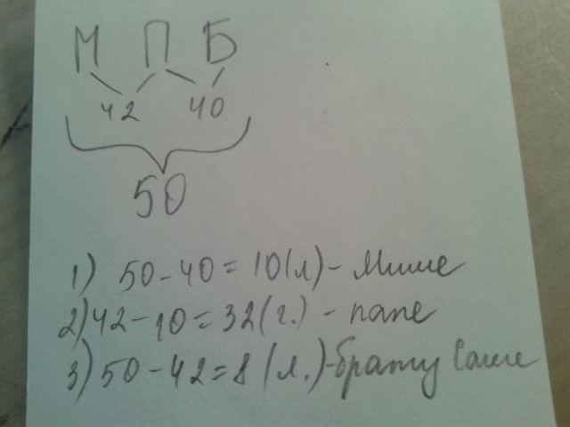 мише вместе с папой 42года ,его брату саше вместе с папой 40лет,а им всем вместе 50лет.узнай сколько лет каждому из них?
