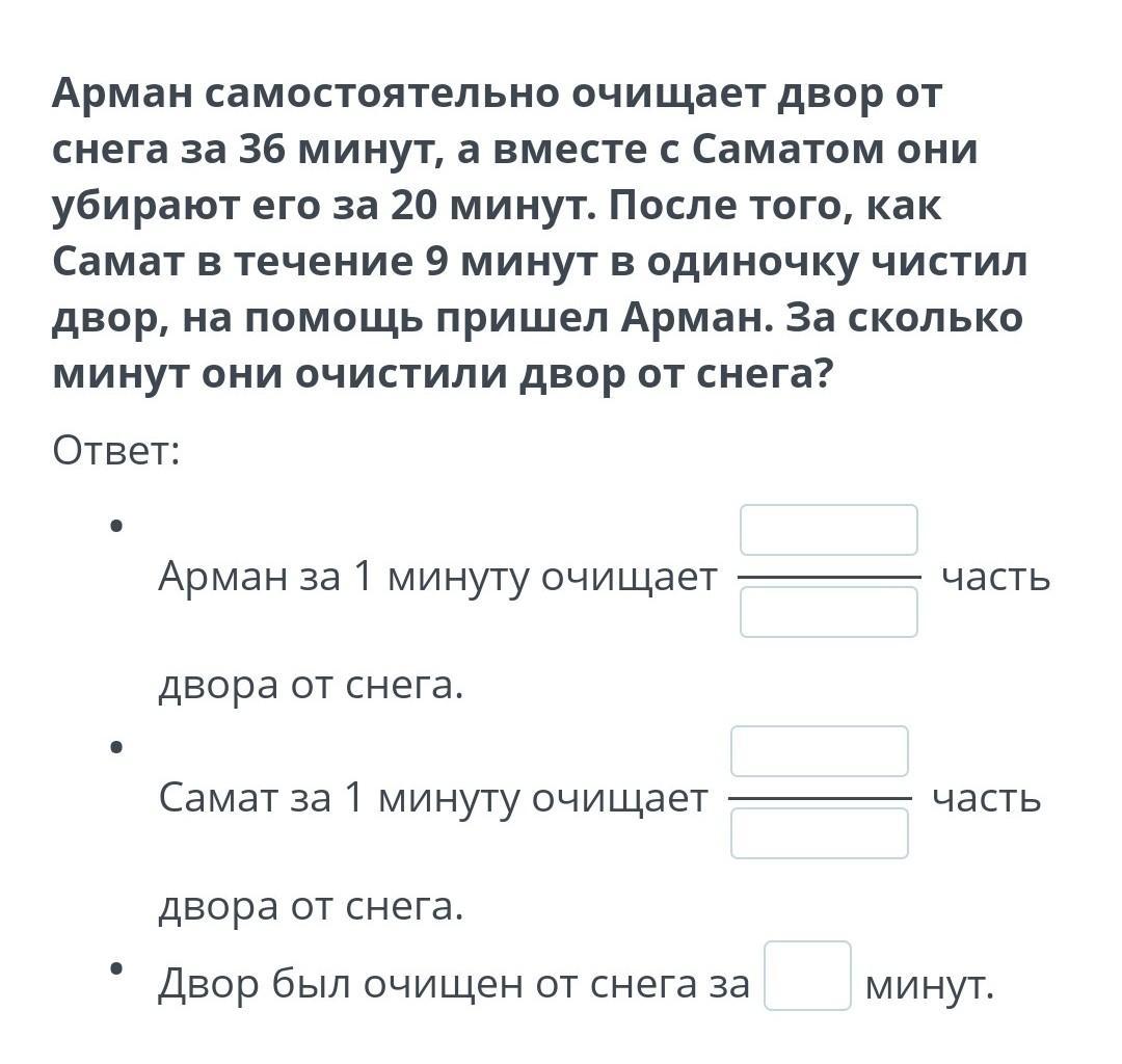 Арман самостоятельно очищает двор от снега за 36 минут, а вместе с Саматом они убирают его за 20 минут. После того, как Самат в течение 9 минут в одиночку чистил двор, на помощь пришел Арман. За сколько минут они очистили двор от снега? Ответ: Арман за 1 минуту очищает часть двора от снега. Самат за 1 минуту очищает часть двора от снега. о Двор был очищен от снега за минут.