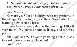 Как ты? Я на каникулах с моей бабушкой в деревне. У меня великолепное время. Догадываешься в чем дело (почему)? Сейчас я учусь ездить на лошади.