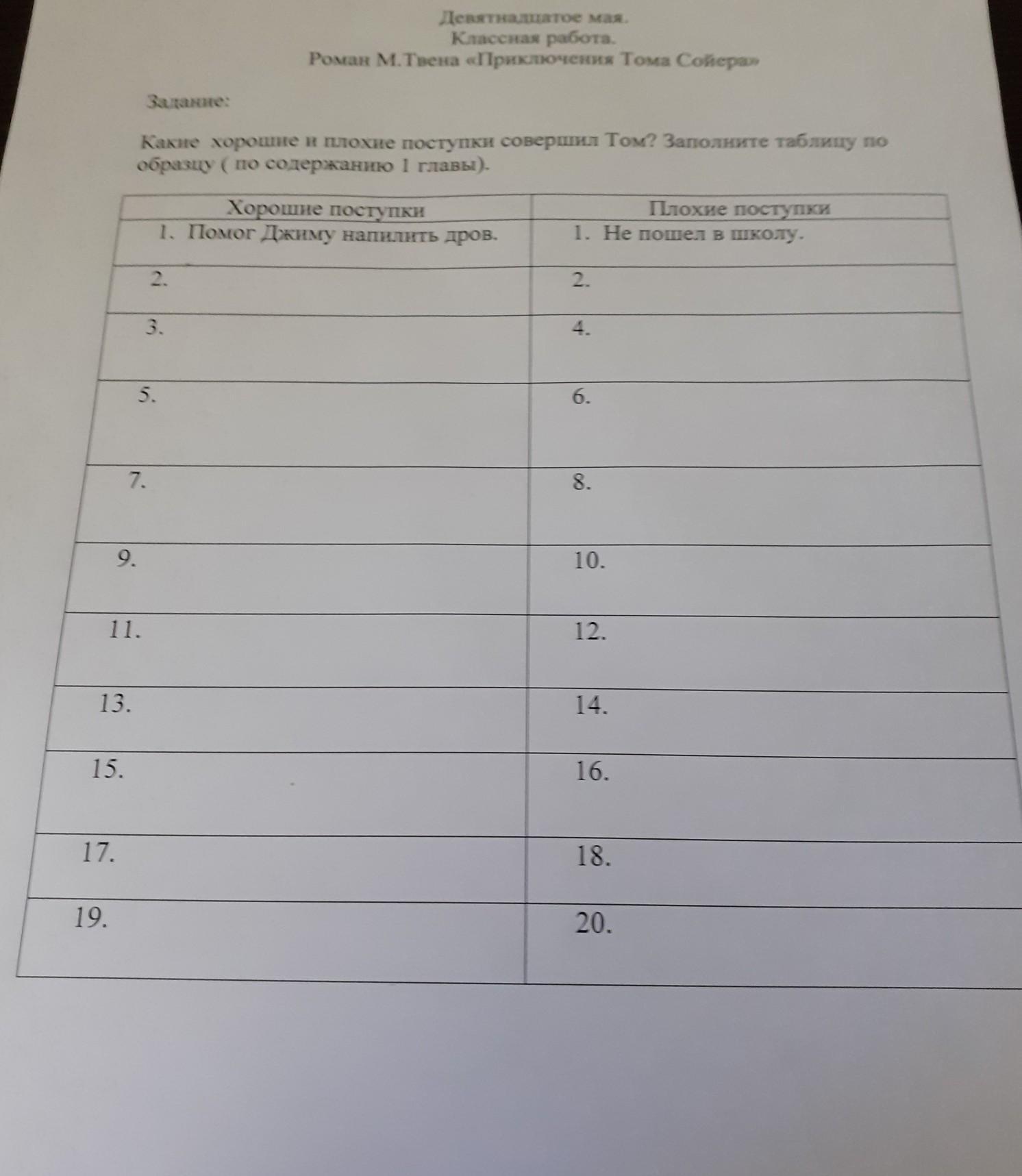 Девятнадцатое мая. Классная работа. Роман М.Твена «Приключения Тома Сойера» Задание: Какие хорошие и плохие поступки совершил Том? Заполните таблицу по образцу ( по содержанию 1 главы). Хорошие поступки 1. Помог Джиму напилить дров. Плохие поступки 1. Не пошел в колу. 2. 2. 3 . 4. 5. 6. 7. 8. 9. 10. 11. 12. 13. 14. 15. 16. 17. 18. 19. 20.