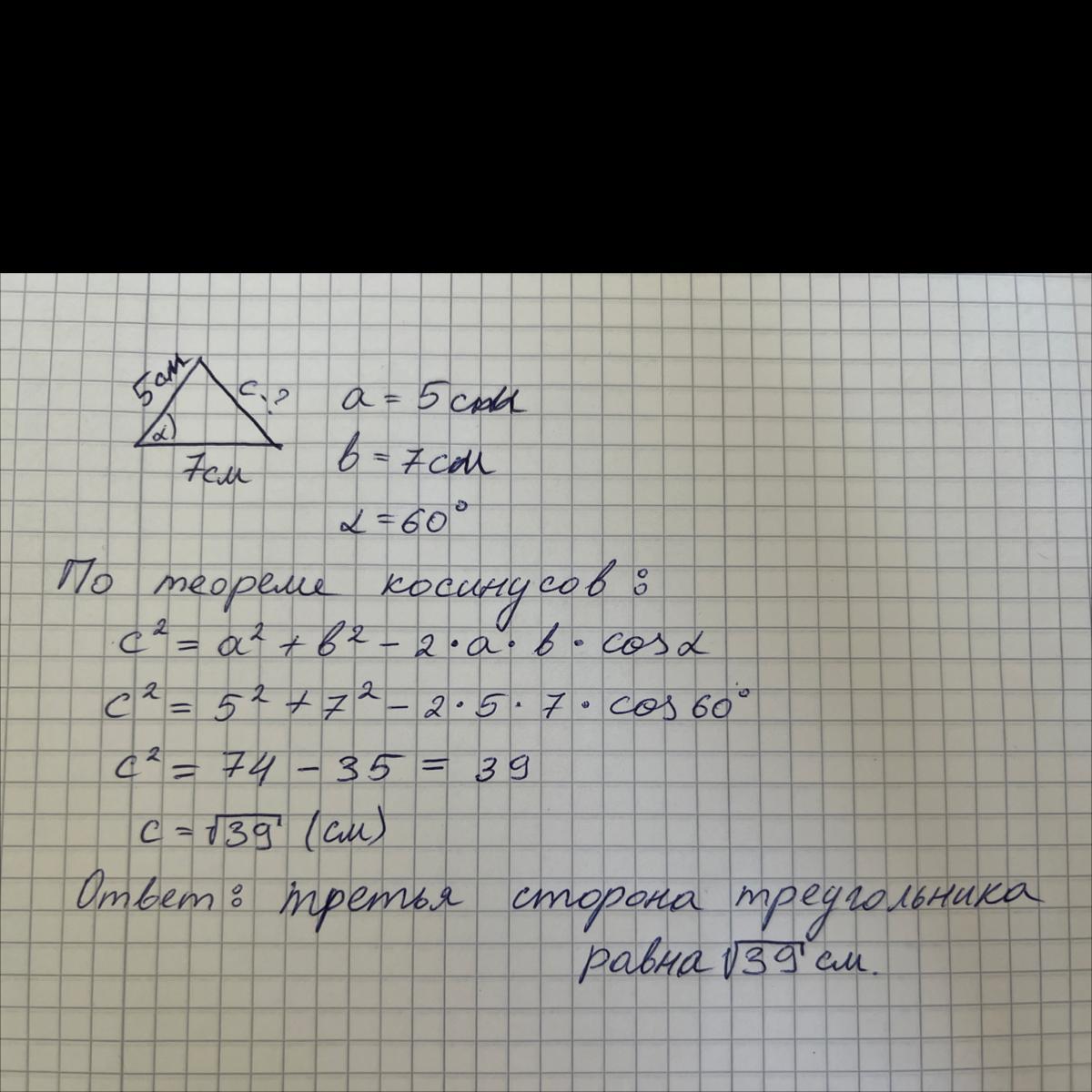 Две стороны треугольника равны 5 см и 7см . а угол между ними равен 60 градусов. Найдите третью сторону треугольника