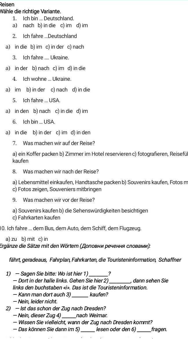 Reisen Wähle die richtige Variante. 1. Ich bin ... Deutschland. a) nach b) in die c) im d) im 2. Ich fahre ... Deutschland a) in die b) im c) in der c) nach 3. Ich fahre .... Ukraine. a) in der b) nach c) im d) in die 4. Ich wohne ... Ukraine. a) im b) in der C) nach d) in die 5. Ich fahre ... USA. a) in den b) nach c) in die d) im 6. Ich bin ... USA. a) in die b) in der c) im d) in den 7. Was machen wir auf der Reise? a) ein Koffer packen b) Zimmer im Hotel reservieren c) fotografieren, kaufen 8. Was machen wir nach der Reise? a) Lebensmittel einkaufen, Handtasche packen b) Souvenirs kaufen, c) Fotos zeigen, Souveniers mitbringen 9. Was machen wir vor der Reise? a) Souvenirs kaufen b) die Sehenswürdigkeiten besichtigen c) Fahrkarten kaufen 10. Ich fahre ... dem Bus, dem Auto, dem Schiff, dem Flugzeug. a) zu b) mit c) in Ergänze die Sätze mit den Wörtern (Доповни речення словами): fährt, geradeaus, Fahrplan, Fahrkarten, die Touristeninformation, Scha 1) - Sagen Sie bitte: Wo ist hier 1). ? - Dort in der halle links. Gehen Sie hier 2). dann sehen Sie links den buchstaben «i». Das ist die Touristeninformation. - Kann man dort auch 3) kaufen? -Nein, leider nicht. 2) - Ist das schon der Zug nach Dresden? - Nein, dieser Zug 4). nach Weimar. - Wissen Sie vielleicht, wann der Zug nach Dresden kommt? - Das können Sie dann im 5) lesen oder den 6) _fragen.