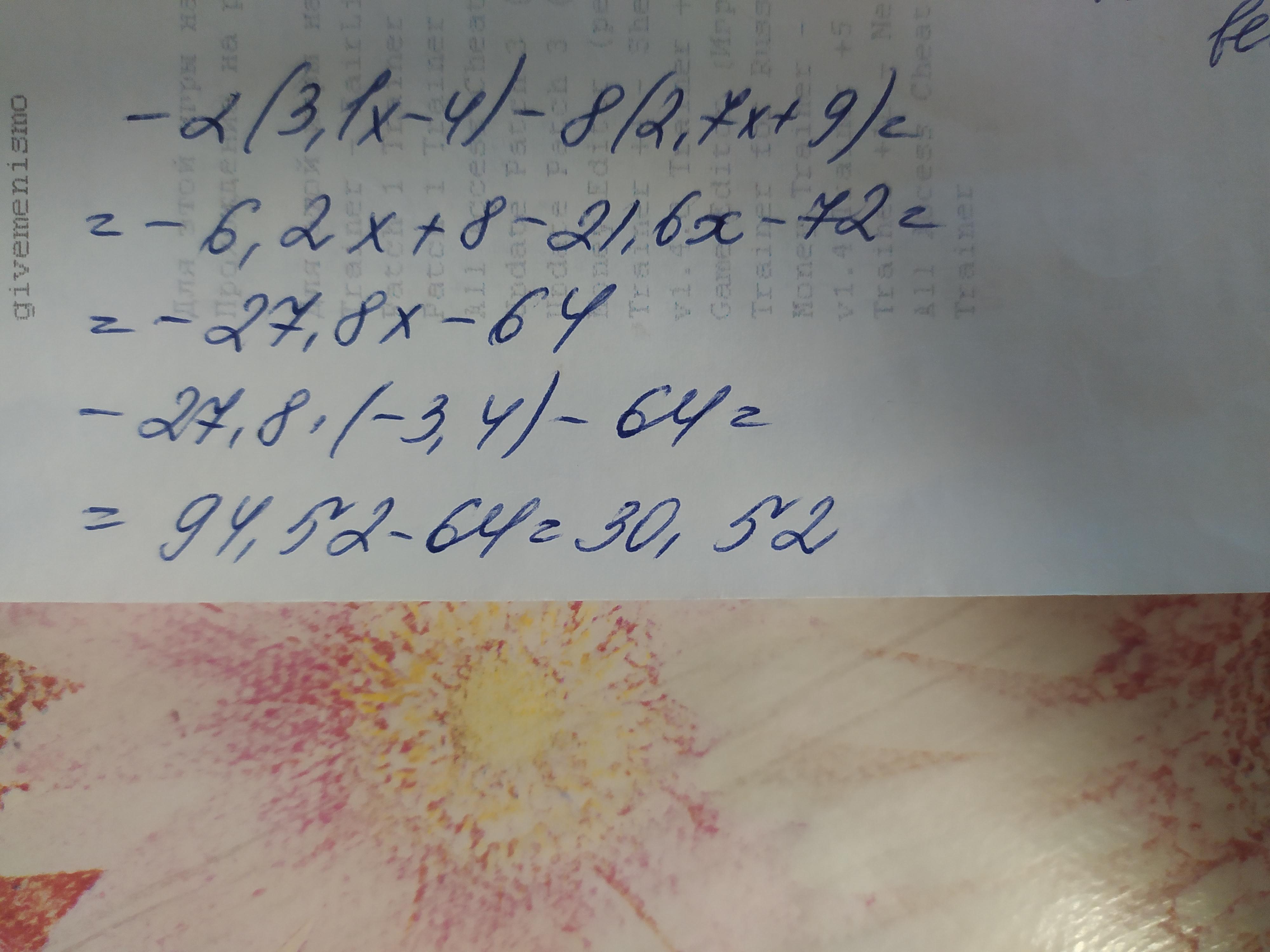 = -6,2х + 8 - 21,6х - 72 = -(6,2х + 21,6х) + (8 - 72) = -27,8х - 64
