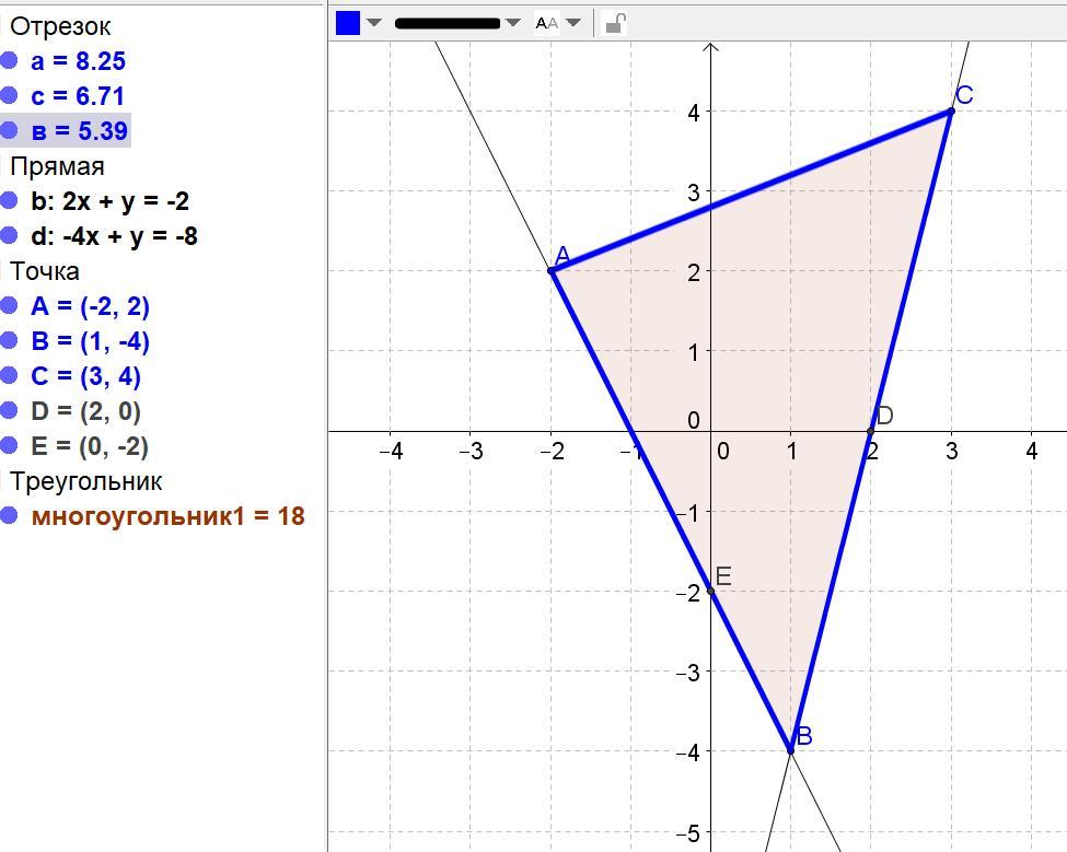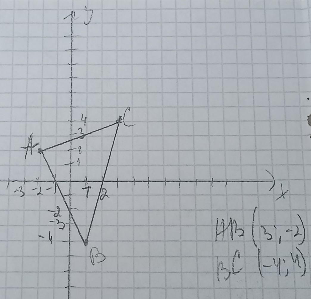 Начертите на координатной плоскости треугольник ABC, если A(-2; 2), В (1; -4), C (3; 4). Найдите координаты точек пересечения стороны AB с осью у и стороны ВС с осью х.