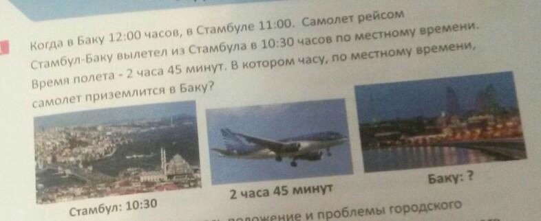 12:15 (это же легко складывай время когда самолёт вылетел и сколько прошло времени а потом делай минус 1 ч ведь в Баку на 1ч меньше.(Если ты учишся в Азербайджане то это легко ;)