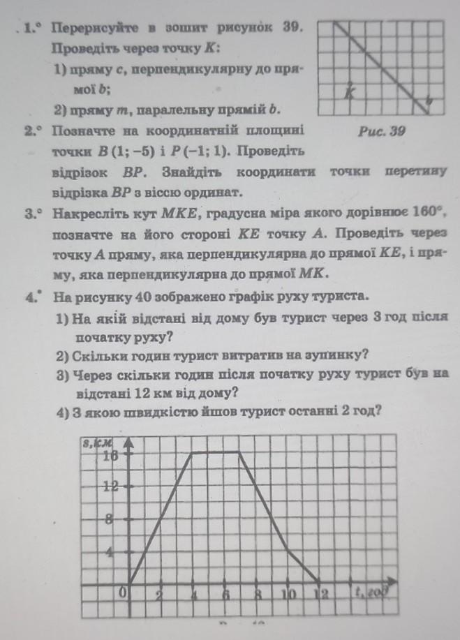 Кому: мені 1. Перерисуile в зошит рисунок 39. Проведіть через точку К: 1) примус, перпендикулярну до пря- моl b: 2) пряку м, паралельну дрій В. 2. Позначте на координатній площині Puc. 39 точки В (1;-5) І Р(-1; 1). Проведіть відрізок ВР. Знайдіть координати точен перетоту відрізка ВР з віссо ординат. 3. Накресліть кут МКЕ, градусна Іра якого дорівниос 160°, позначте на його стороні КЕ точасу А. Проведіть через точку А пряму, шка перпендикулярни до прямої кв, і пря- му, ока перпендикулярна до прямої мк. 4." На рисунку 40 зображено графік руху туриста. 1) На якій відстані від дому був турист через 3 год після початку руху? 2) Скільки годин турист витрати на зупинку? 3) Через скільки години після початку руху турист був на підстані 12 км від дому? 4) Закою жидкісто ішов турист останні 2 год? 10 -8 0 L.208 По о. Rinnonic Переслати