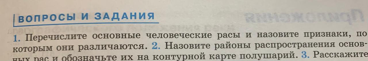 Расові відмінності є результатом пристосування людей до певних умов існування, а також історичного та суспільно-економічного розвитку людського суспільства. Виділяють три великі раси: європеоїдна (євразійська), монголоїдна (азіатсько-американська) та австрало-негроїдна (екваторіальна)