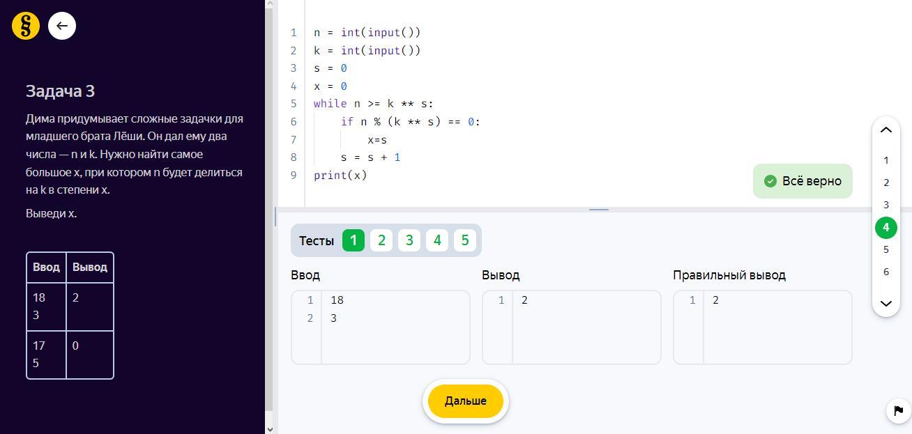 - неполный оператор ветвления (if n % (k ** s) == 0:) с условием (n % (k ** s) == 0) - если первое число (n) делится на второе число (k) в степени (s) без остатка