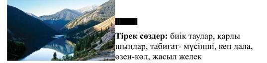 Тірек сөздер: биік таулар, қарлы шыңдар, табиғат- мүсінші, кең дала, өзен-көл, жасыл желек(написать 10 предложений используя эти слова про озеро Әнші күм или Шайтанкөл)