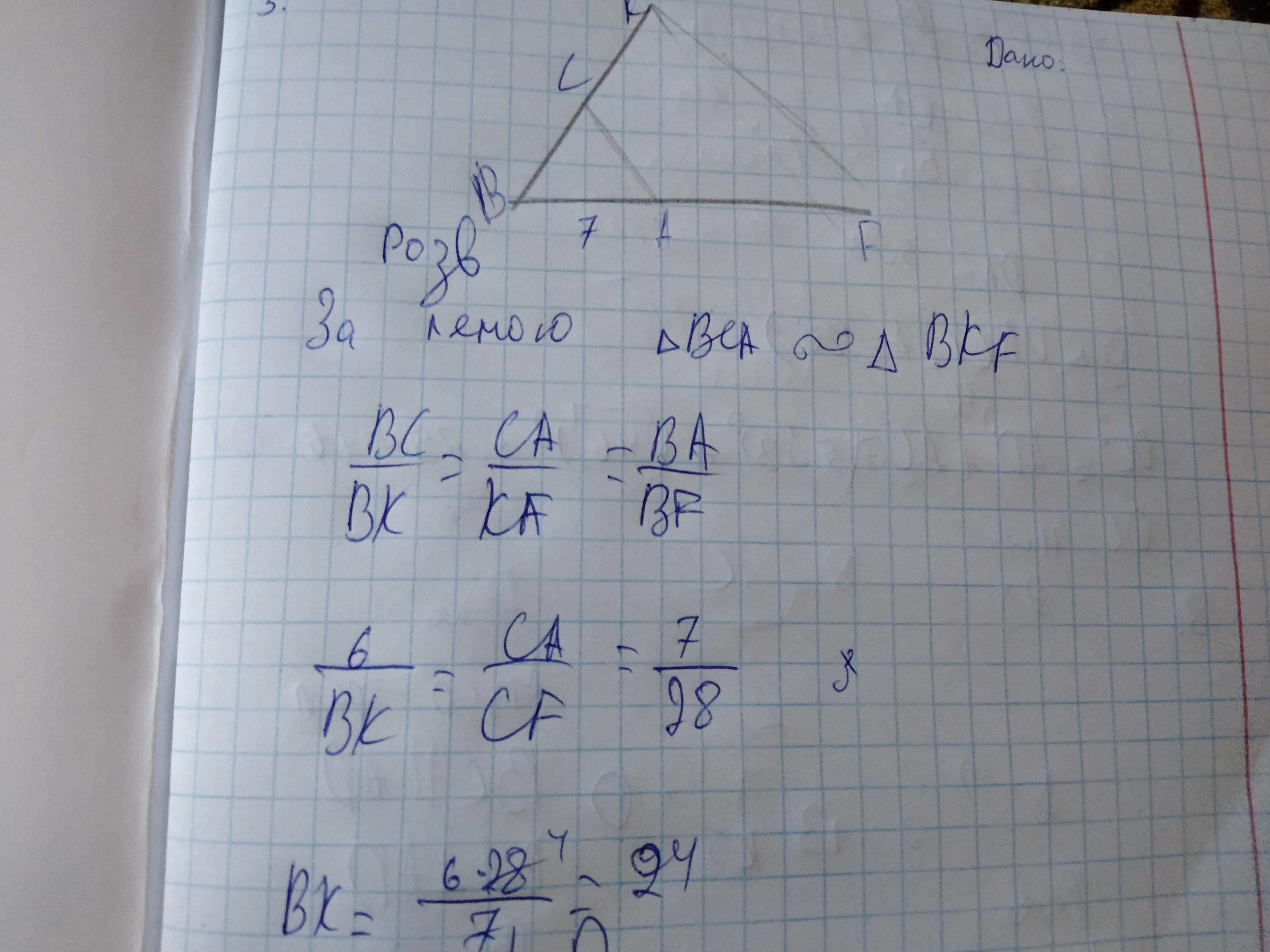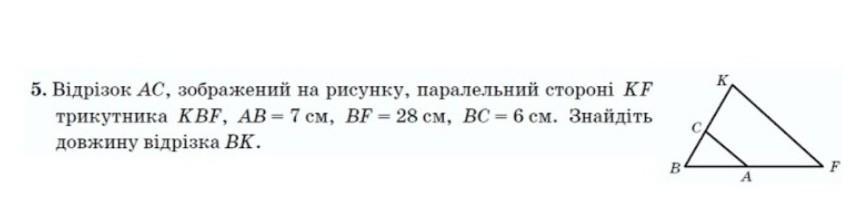 Вiдрiзок АС, зображений на рисунку, паралельний стороні KF трикутника KBF, AB= 7 см, BF = 28 см, BC = 6 см. Знайдіть довжину відрізка ВК