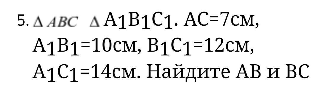 Задание 5 ∆ABC ∆А1В1С1. АС=7см, А1В1=10см, В1С1=12см, А1С1=14см. Найдите АВ и BC.
