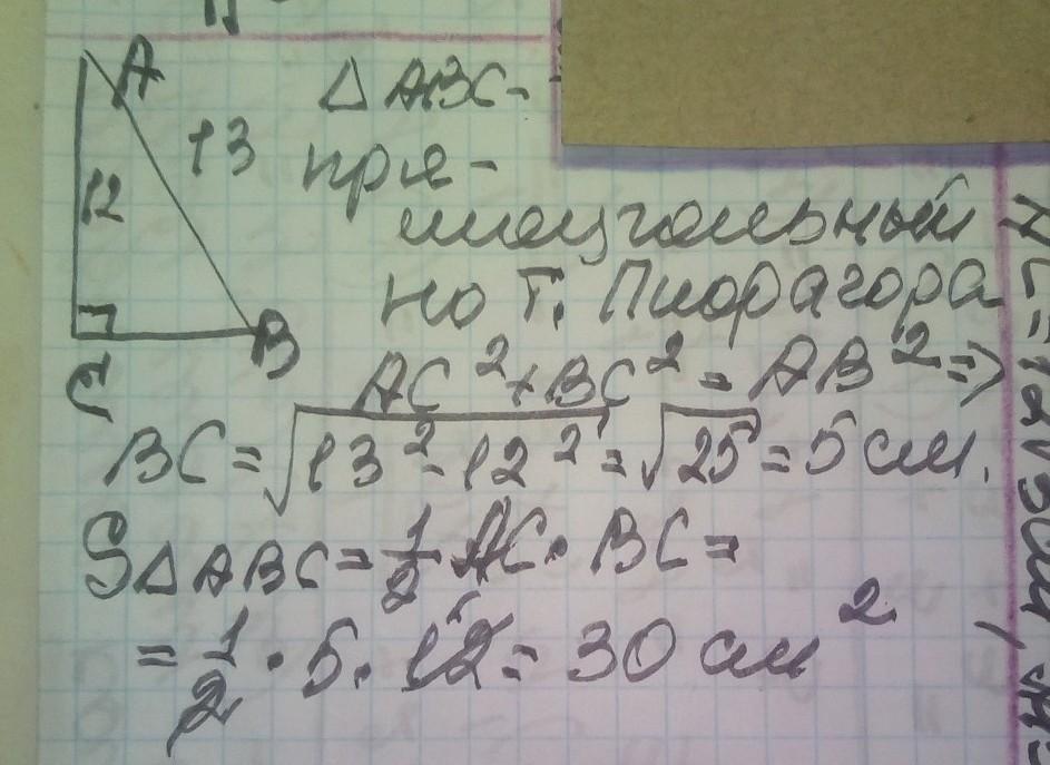 Один з катетів прямокутного трикутника 12см, а гіпотенуза - 13см знайдіть площу трикутника