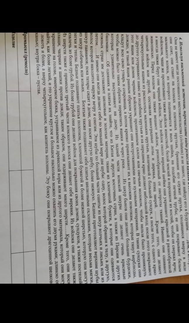 ПОМОГИТЕ СРОЧНО СОЧ 4. Используя письменный источник, перечислите виды ремесла казахов и соответствующие изделие (5 баллов) Они не имеют нигде постоянного местожительства (civitatem) и не знают, где найдут его в будущем...... Дом, в котором они спят, они ставят на колесах из плетеных прутьев, бревнами его служат прутья, сходящиеся кверху в виде маленького колеса, из которого поднимается в высь шейка, на подобие печной трубы; ее они покрывают белым войлоком, чаще же пропитывают также войлок известкой, белой землей и порошком из костей, чтобы он сверкал ярче; а иногда также берут они черный войлок. Этот войлок около верхней шейки они украшают красивой и разнообразной живописью. Перед входом они также вешают войлок, разнообразный от пестроты тканей. Именно они сшивают цветной войлок или другой, составляя виноградные лозы и деревья, птиц зверей. ....... Кроме того, они делают четырехугольные ящики из расколотых маленьких прутьев, величиной с большой сундук, а после того, с одного краю до другого устраивают навес из подобных прутьев и на переднем краю делают небольшой вход; после этого покрывают этот ящик или домик черным войлоком, пропитанным салом или овечьим молоком, чтобы нельзя было проникнуть дождю, и такой ящик равным образом украшают они пестротканными или пуховыми материями. В такие сундуки они кладут всю свою утварь и сокровища, а потом крепко привязывают их к высоким повозкам, которые тянут верблюды, чтобы можно было таким образом перевозить ящики и через реки........Из шкур быков они делают большие бурдюки, которые удивительно высушивают на дыму. Из задней части конской шкуры они делают очень красивые башмаки......Об одеяниях и платье их знайте, что из Китая и других восточных стран, а также из Персии и других южных стран им доставляют шелковые и золотые материи, ткани из хлопчатой бумаги, в которые они одеваются летом......И зимою они всегда делают себе по меньшей мере две шубы: одну, волос которой обращен к телу, а другую, волос которой находится наружу ветру и снегам. Эти шубы по большей части сшиты из шкур волчьих и лисьих или из шкур павианов; пока татары сидят в доме, они носят другую шубу, более нежную. Бедные приготовляют верхние шубы из шкур собачьих или козьих..... Богатые также подшивают себе платье шелковыми охлопками, которые весьма мягки, легки и теплы. Бедные подшивают платья полотном, хлопчатой бумагой и более нежной шерстью, которую они могут извлечь из более грубой. Из более грубой они делают войлок для покрывания своих домов, сундуков, а также постелей. Из шерсти также с примесью третьей части конского волоса они делают себе веревки. Из войлока они делают также плащи, чапраки и шапки против дождя; таким образом, они издерживают много шерсти........ Кроме того, они носят украшение на голове, именуемое бокка, устраиваемое из древесной коры или из другого материала, который они могут найти, как более легкий, и это украшение круглое и большое насколько можно охватить его двумя руками; длиною оно в локоть и более, а вверху четырехугольное, как капитель колонны. Эту бокку они покрывают драгоценной шелKOBOЙ TKaHbЮ; Bнутри бокка - пустая. Промысел (ремесло) Изделие