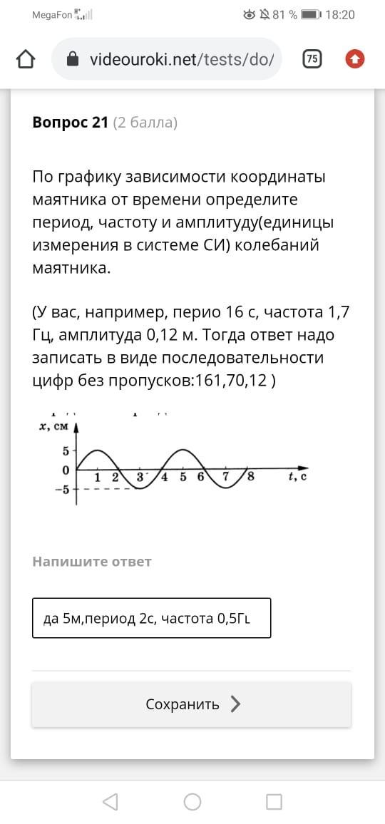 21 - T=4 c; v=0,25 Гц; A=0,05 м Ответ: 40,250,05