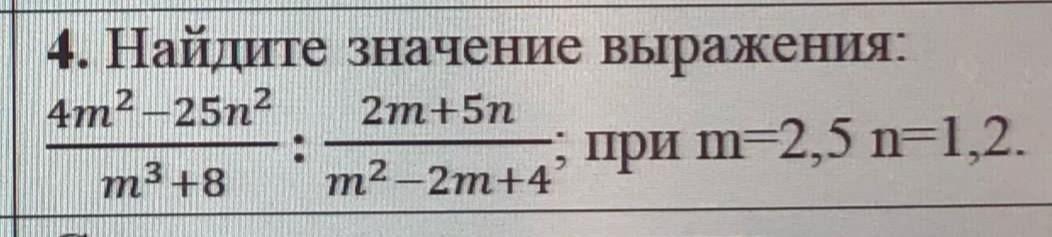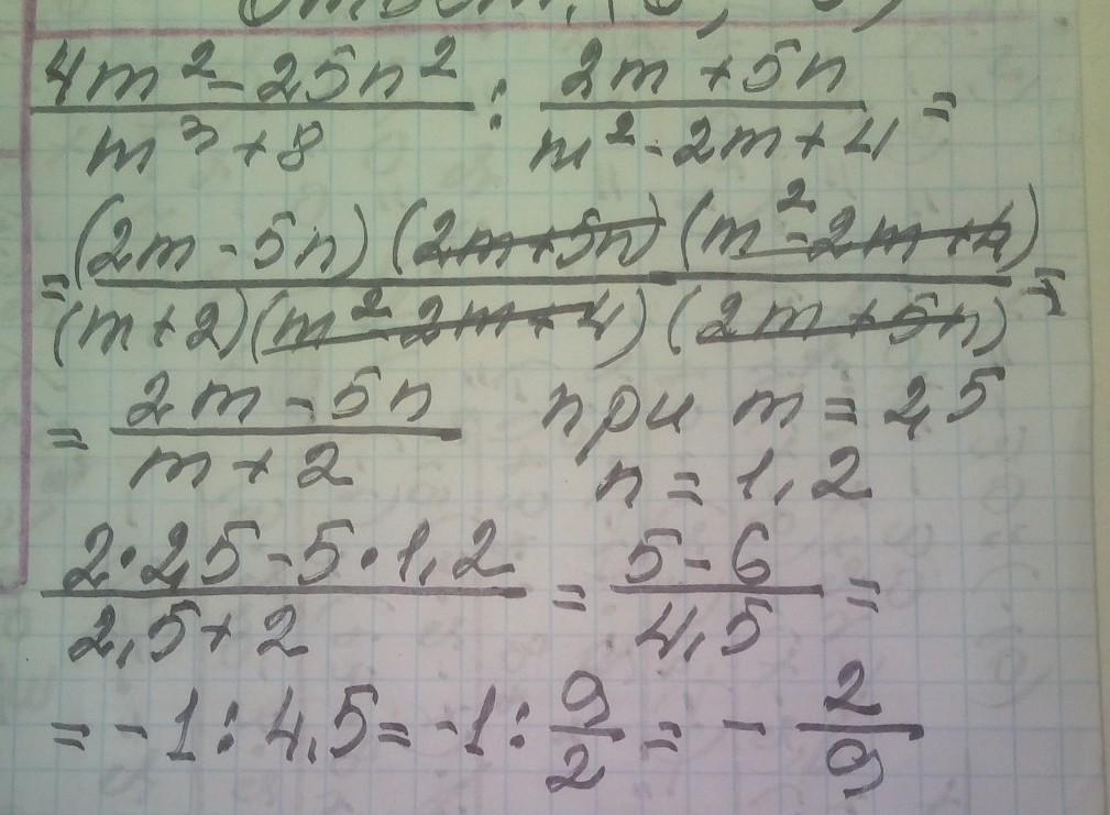 найдите значение выражения 4m^2-25n^2/m^3+8 : 2m+5n/m^2-2m+4 при m=2,5 n=1,2