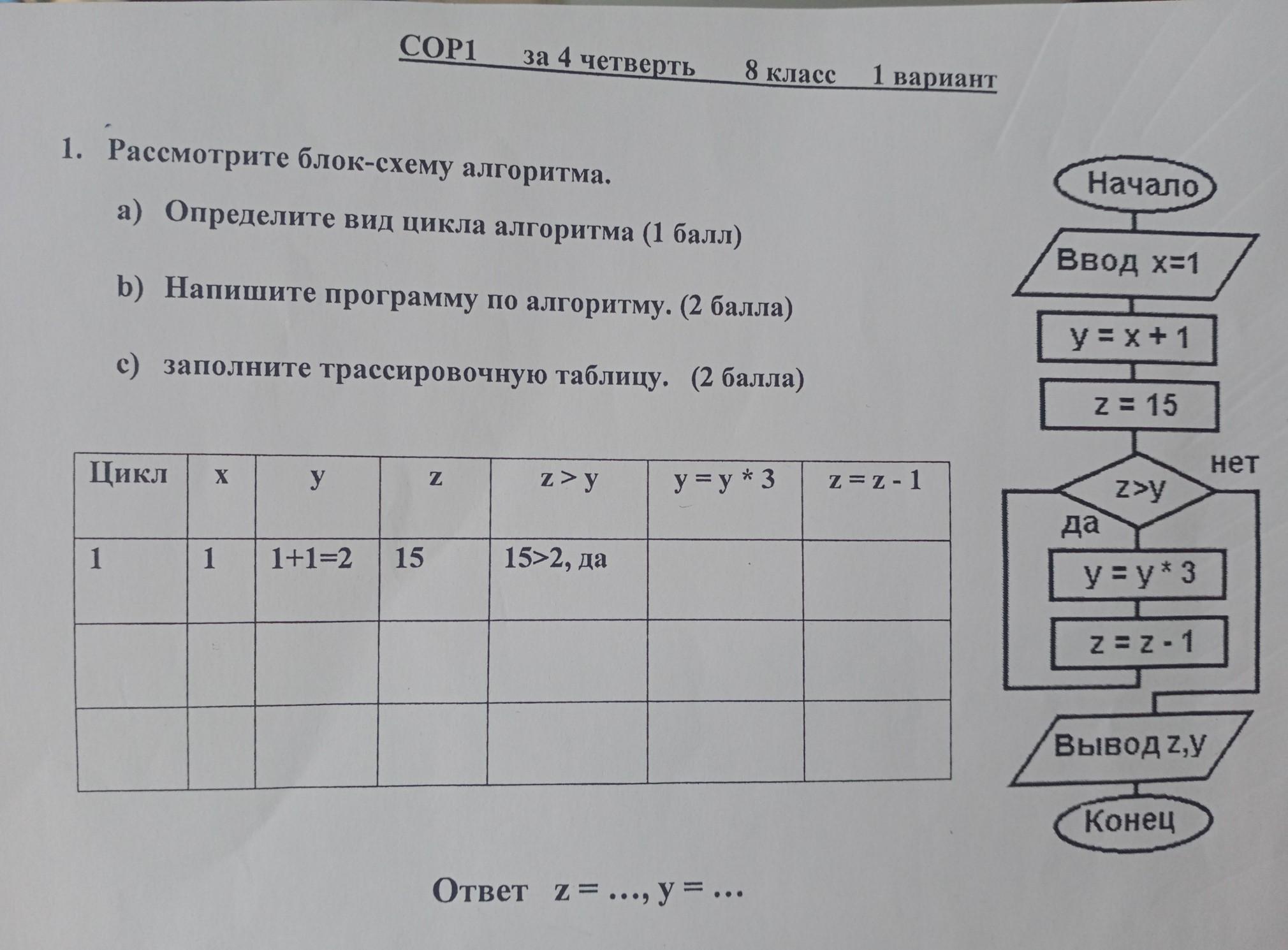 1. Рассмотрите блок-схему алгоритма. а) Определите вид цикла алгоритма (1 балл) b) Напишите программу по алгоритму. (2 балла) c) заполните трассировочную таблицу. (2 балла)