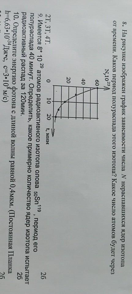 8) N=(N_0)/(2^(t/T)),здесь N_0-число ражиоактивных атомов в начальный момент времени,N-число радиоактивных атомов во времени t, и отсюда можно выразить Т-период полураспада
