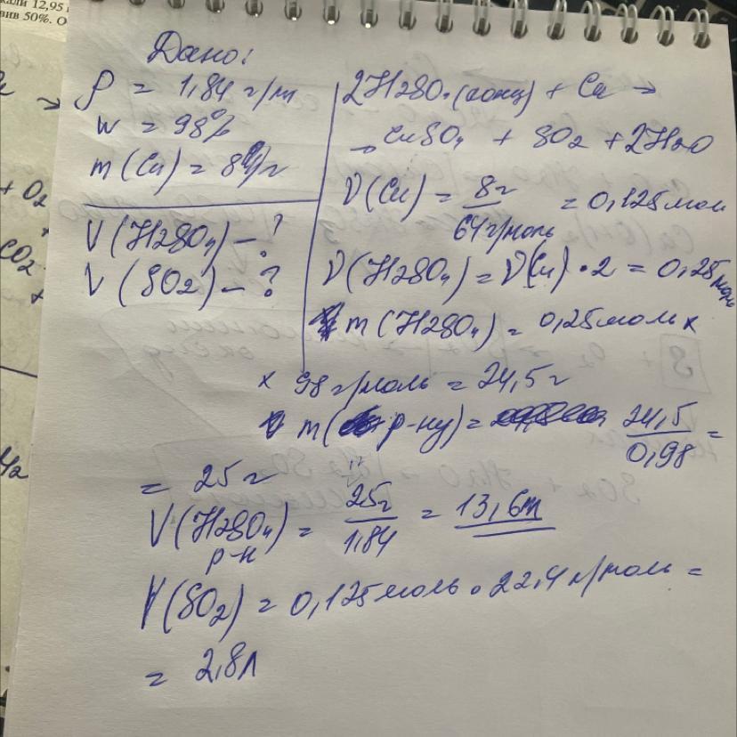 ДАЮ 40 БАЛОВ Який об’єм концентрованої сульфатної кислоти густиною 1,84 г/мл, з масовою часткоюкислоти 98%, необхідно взяти для повного розчинення міді масою 8 г? Який об’єм сульфур(IV) оксиду(н.у.) виділиться? пж очень надо